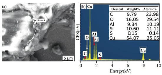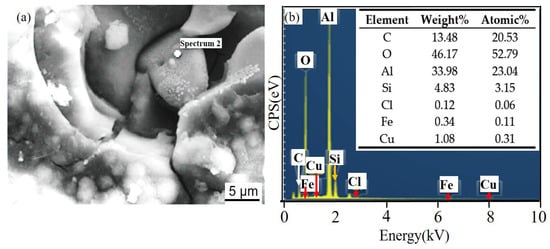 EDS of corrosion products in corrosion pits of 6061Al alloy after SL for 21 days. (a) SEM image of corrosion products; (b) EDS of corrosion products.