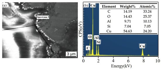 EDS of matrix cracks in SiC3D/6061Al after SL for 61 days. (a) SEM image of matrix cracks; (b) EDS of matrix cracks.