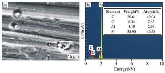 EDS of SiC phase at the interface of SiC3D/6061Al after SL for 21 days. (a) SEM image of SiC phase; (b) EDS of SiC phase.