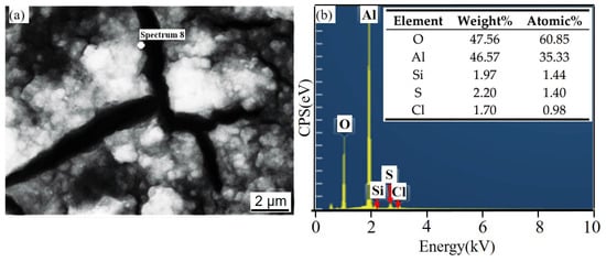 After 168 h, EDS of the surface of the 6061Al alloy in Figure 8j reveals that the Mg and Cu elements are contained in the bare substrate. The damaged Al2O3 film is in the active state as the anode, and the undamaged film remains in the passive state as the cathode, which constitutes an activation–passivation battery [26,27]. The oxidation-reduction reaction dissolves the metal in the pore to maintain the electrical neutrality in the pore, Cl− migrates into the pores, and the pH value decreases. Under the action of H+ and Cl−, the metal is activated, forming a pore activation (inside)–passivation (outside) corrosion battery, and the migration of Cl− increases. The pH drops further, promoting further corrosion. The product on the outer surface is Al(OH)3, which further decomposes into Al oxides, occasionally containing some chlorine, sulfur, and mineral salt elements, consistent with the surface EDS analysis.