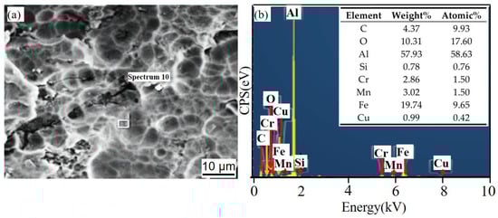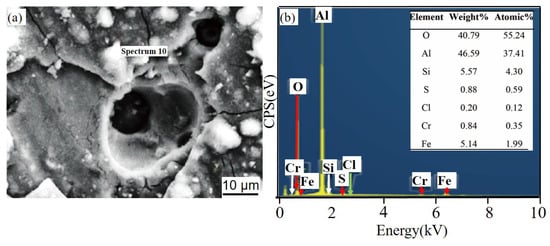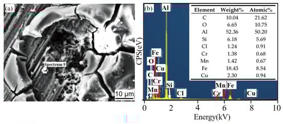 EDS of 6061Al alloy in corrosion pit after SL for 150 days. (a) SEM image of corrosion pit; (b) EDS of corrosion pit.