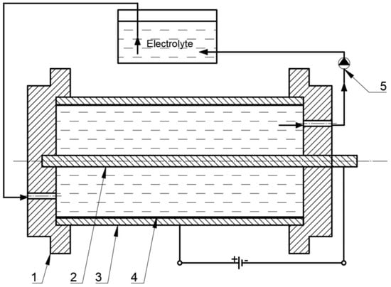 Diagram of the stand for the oxidation of cylinders with forced electrolyte flow circulation: 1—mounting bracket, 2—cathode, 3—cylinder (anode), 4—oxide layer formed, 5—pump.