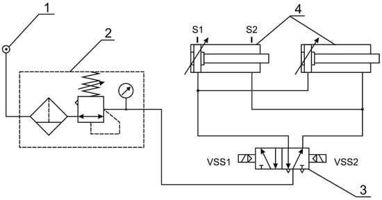 Stand for measuring the operation of actuators: 1—compressor, 2—compressed air preparation block, 3—diverting valve (VSS1, VSS2—valve coils), 4—double-acting actuators (S1, S2—reed sensors).