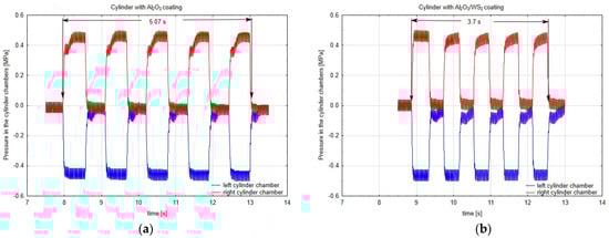 Pressure chart in the cylinder chamber (a) with Al2O3 coating—C1 cylinder, (b) with Al2O3/WS2 coating—C2 cylinder.