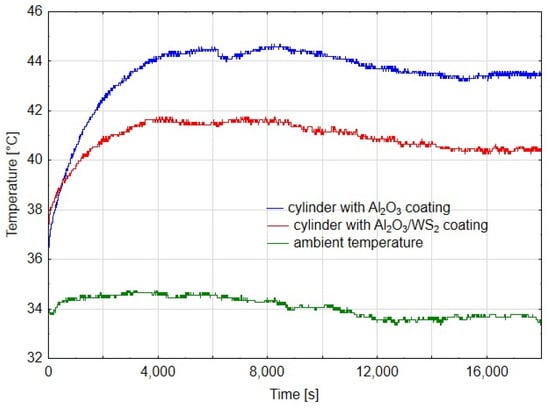 Figure 5, Figure 6 and Figure 7 show diagrams of temperature measured on cylinders in the area of the friction zone after 14 h, 80 h and 180 h of actuator operation, respectively. The diagrams were made for the first phase of the test, when the actuators worked evenly, after 80 h, when a change in the speed of the C1 actuator piston rod was noticed, and after 180 h in the final stage of the experiment. In addition to the temperature measured on the cylinders, the charts also show the ambient temperature. In diagram 5, the temperature measured for the cylinder C1 is characterized by an irregular course, it is related to the jumps in temperature values in the initial phase of the running-in of two elements. Assuming that the average temperature for C1 was 44 °C, and for C2 40 °C, it can be shown that the temperature in the cylinder C2 was about 9% lower than that in C1. In the case of cylinder temperature measurements after 80 h of operation, where the first differences in the speed of the piston rod movement of both cylinders were noticeable, the average value of the stabilized temperature graph for C1 was 44 °C, and for C2 it was 41 °C, which was a value of approx. 7% lower compared to C1. Both diagrams show a linear course, which suggests the running-in of the sliding friction elements. After 180 h of operation, the difference in cylinder operation temperature was approx. 2%. However, the very irregular cycle of operation of the C1 cylinder, resulting from high resistance to movement of the cylinder piston, excluded it from further tests, which were also completed for the C2 cylinder. As can be deduced from Figure 5, Figure 6 and Figure 7, the ambient temperature also influenced the temperature measurement in the cylinders. For the higher ambient temperature, the temperature measured in the cylinders was also higher. The trend, however, was maintained and therefore, conclusions can be drawn when comparing the temperatures in the area of the friction zone, which was one of the main objectives of the study. The temperature difference between the cylinder C1 and C2 in the first stage of the tests (Figure 5) results from the nature of the cooperation of the cylinder piston seals with the Al2O3 layer, which the greater resistance to movement than in the case of cylinder C1, generating a higher temperature. The reduction of the temperature difference between the cylinders C1 and C2, in the further part of the tests (Figure 6 and Figure 7), may have two reasons: a change in the character of the running-in tear to the stabilized stage and a change in the speed of the cylinder piston rod C1. The reduction of this speed generated a lower temperature at the seal-cylinder interface; hence the temperature of cylinder C1 decreased.