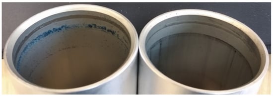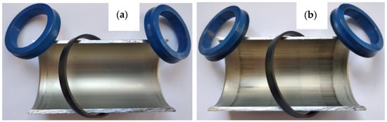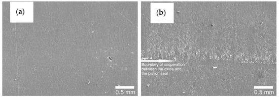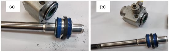 After the stand tests were completed, the test system was disassembled, and the macroscopically visible differences are shown in Figure 8a,b. After disassembling the cylinder with the C1 cylinder, wear products of the piston seals were noticed (Figure 8a). In the case of the C2 actuator, no such wear was noticed (Figure 8b).