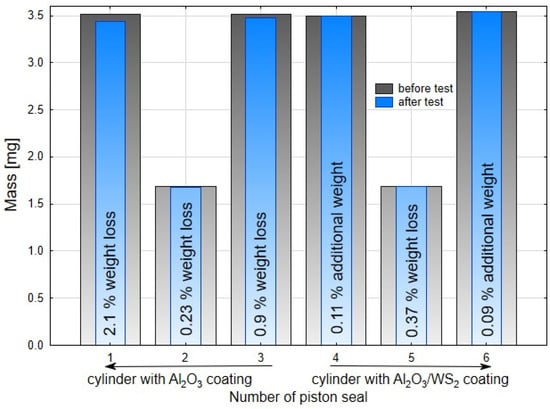 The black area on the surface of cylinder C2, also visible in Figure 9 on the right, is the so-called sliding film. It was created as a result of cooperation of the sliding guide seal of the piston made of T5W material with the surface of the Al2O3/WS2 layer. The formation of such a sliding film in sliding associations operating under conditions of technically dry friction is closely related to the process of wear of the plastic and its transfer to the surfaces of the oxide layers. The cooperation of the scraper seals with the surface of the C2 cylinder resulted in the transfer of the T5W material also to the surfaces of the blue scraper seals, which resulted in the proper operation of the elements of the sliding system of this actuator. The application of the sliding film on the cylinder bearing surface C2 was possibly due to the prelubrication, which was most likely due to the addition of WS2 to the SFS electrolyte in the formation of the layer on the cylinder bearing surface. Solid lubricant in the form of WS2 introduced into the structure of the Al2O3/WS2 layer caused initial slip of the scraper seals on the oxide layer, reducing the movement resistance and wear of these seals, as was the case in the cylinder C1 of the actuator (Figure 9). Figure 11 shows the weight of the seals before (grey bars) and after (blue bars) the bench test. In the case of seals cooperating with the C1 cylinder, a weight loss was observed for all three seals. Approx. 2.1% weight loss was recorded for the left wiper seal, and approx. 0.9% of the initial mass for the right one. The products of this wear are shown in Figure 8a and Figure 9 (left cylinder). The piston guide seal lost approximately 0.23% of its original weight upon interaction with the C1 cylinder Al2O3 layer. In the case of the seals cooperating with the C2 cylinder, the weight was higher than the initial weight by about 0.11% for the left seal and 0.09% for the right wiper seal. It is related to the applied black layer of T5W material, shown in Figure 10b. The piston guide seal lost approximately 0.37% of its original weight upon engagement with the surface of the C2 cylinder.