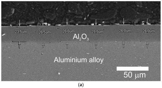 Taking into account the error resulting from the measurement method and the standard deviation, it can be concluded that both layers were of similar thickness. The thickness of the Al2O3 layer formed on the substrates of aluminum alloys, equal to about 25 μm, is sufficient for tribological cooperation in systems of technically dry friction with plastics.