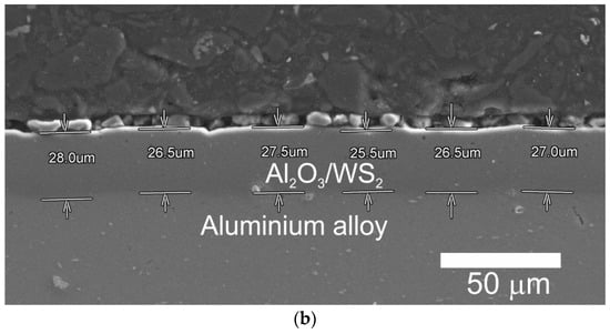 Figure 11 shows the thickness of the Al2O3 layer produced on the cylinder C1 (Figure 12a) and the thickness of the Al2O3/WS2 layer produced on the cylinder C2 (Figure 12b). The layer thickness on cylinder C1 was approximately 25.58 ± 1.07 μm, and on cylinder C2 approximately 26.83 ± 0.87 μm.