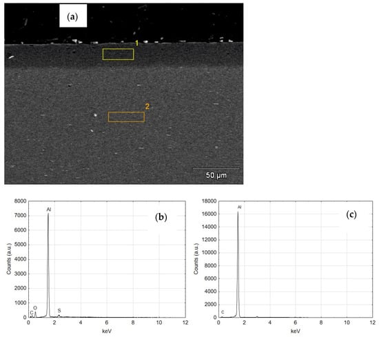 Figure 13a shows a SEM photo of a transverse view of cylinder 1 with the marked areas indicating the location of the SEM/EDS analysis. As can be seen from the spectrum of the first area in Figure 13b, the darker area on the cross-section is the aluminum oxide layer, while the lighter area is the base of the layer, i.e., aluminum alloy Figure 13c.