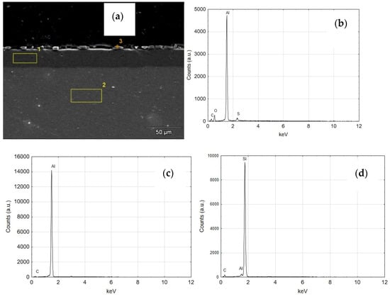 Figure 14a shows a SEM photo of the C2 cylinder cross-section with the three SEM/EDS analysis areas marked. The first area was characterized during the qualitative analysis as an Al2O3 oxide layer—Figure 14b, the second area as an aluminum alloy—Figure 14c. Area 3 indicates silicon particles—Figure 14d from grinding the cross-sections that got between the tested cylinder and the resin in which the sample was incorporated.