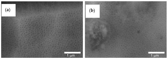 Figure 16, Figure 17 and Figure 18 show the cylinder bearing surface after the operational test. Figure 16b shows a clear border between the area of tribological cooperation of the wiper seal with cylinder C2, and the area where the layer from outside this area can be observed. Part of the cooperation area in the case of the C2 cylinder is characterized by an applied sliding film, clearly visible as a black area in Figure 10b. This phenomenon is not observed in the case of the C1 cylinder, which also confirms the macroscopic observations. The images also show a mesh of grains reflecting the microstructure of the aluminum alloy substrate, which is also shown in Figure 17 at a magnification of 500×. Figure 18a,b in the magnification of 25,000×, the nanoporous surface morphology typical for the Al2O3 oxide layers was observed. As our research has shown for the Al2O3 layer thickness of approx. 25 μm, apart from the typical surface morphology visible at high magnifications, at lower magnifications it is possible to perfectly observe the microstructure of the aluminum alloy substrate, on which the amorphous aluminum oxide layer grows. The boundaries of aluminum grains become the source of unevenness formed on the surface of the aluminum oxide.