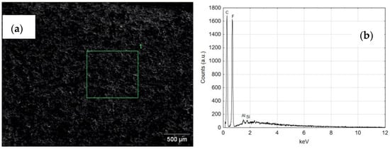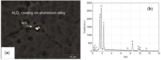 (a) The surface of the Al2O3 coating (C2 cylinder) at the border of tribological cooperation with the applied sliding film containing WS2 powder, (b) EDS spectrum of the area indicated in (a) image.