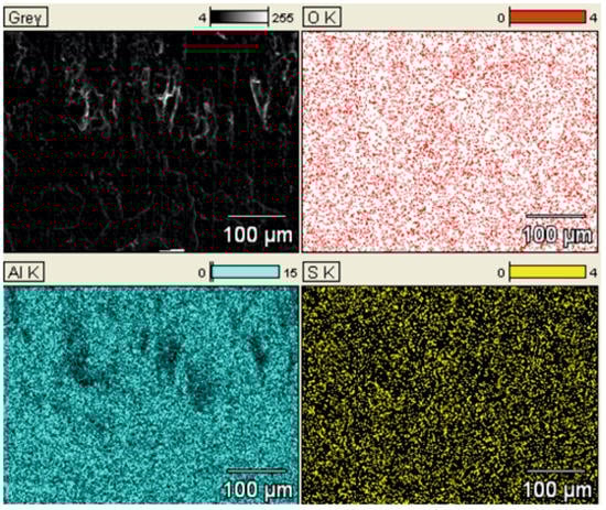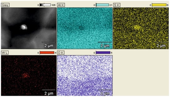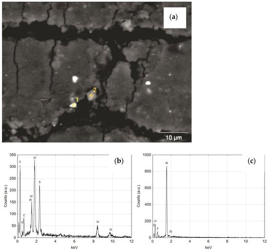 Figure 19a shows a SEM YAGBSE image made with the use of backscattered electrons. Only with this type of identification it was possible to reveal the modifier present on the surface of the oxide layer in the form of tungsten disulfide WS2 powder—Figure 19b. Figure 20 shows the SEM/EDS mapping of the C2 cylinder surface with visible WS2 powder embedded in the microstructure of the Al2O3 oxide layer. The figure shows the share of individual elements Al, S, W and O in the scanned area.