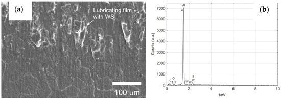 The qualitative EDS analysis was also carried out for the skid film formed on the inner surface of the cylinder C2—Figure 21. The SEM/EDS image mapping (Figure 22) shows no tungsten in the elemental fraction in the scanned area. Limiting the scanned area for EDS analysis to a small area indicated in Figure 21a allows to reveal the presence of tungsten disulfide in the formed sliding film (Figure 21b). As the research carried out shows, in order to reveal the presence of WS2 lubricant in the sliding film deposited on the Al2O3 layer, it is necessary to conduct an in-depth qualitative analysis of SEM/EDS. Mapping itself is not sufficient in this case.