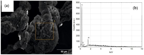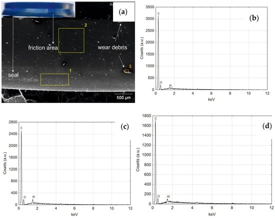 Figure 24 shows the SEM and EDS photos of the wiper seal cooperating with the surface of the cylinder C1. Both regions 1 and 2 reveal the elemental composition corresponding to the material of the wiper seal (Figure 24b,c). The reflections from aluminum indicate that wear products appear on the seal, originating from the Al2O3 oxide layer and the wiper seal (Figure 24d). The image of the wear product resulting from the cooperation of the seal with the C1 cylinder surface is shown in Figure 25a, its qualitative analysis EDS in Figure 25b. The artefact visible in the image is a conglomerate of wear products of the wiper seal and the Al2O3 aluminum oxide layer.