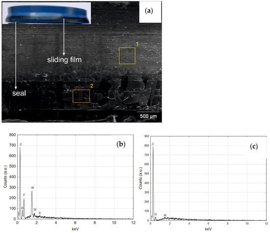 (a) SEM image of the seal cooperating with C2 cylinder with visible area of the sliding film, (b) EDS spectrum of area 1 (c) EDS spectrum of area 2.