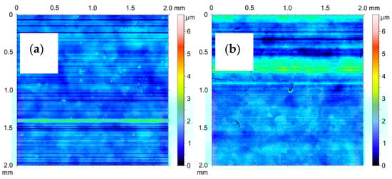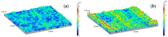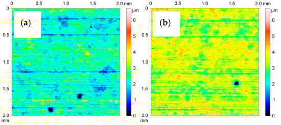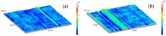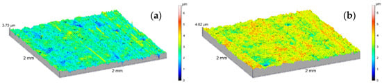 The amplitude parameters of the tested surfaces are summarized in Table 1. The 3D visualization of the geometric surface of the measured elements is shown in Figure 31, Figure 32 and Figure 33. The amplitude parameters of the tested surfaces are also partially shown in the graphs—Figure 34. The analysis of the surface topography showed that the starting material was characterized by the lowest parameter of the mean surface roughness deviation Sq = 0.36 μm, and etching preparing the surfaces for oxidation increased this parameter to the value of Sq = 0.47 μm. Oxidation of the C1 cylinder surface in the SFS electrolyte did not significantly affect the average the Sq value, which was 0.46 μm, while the oxidation of the C2 cylinder in the SFS electrolyte with WS2 addition slightly increased the Sq value to 0.54 μm. The parameters Ssk and Sku determine the asymmetry (skew) and surface slope (kurtosis), respectively, and are sensitive to large individual extremes. Negative values of the skewness coefficient Ssk = −0.5 and Ssk = −0.15 were obtained for the smooth surfaces of C1 and C2 cylinders, respectively, before tribological cooperation. After tribological cooperation, this parameter changed and was, respectively, for C1: Ssk = −0.78 and for C2: Ssk = 1.02. The negative skewness of the examined layers indicates the surface of the layers of a plateau character, which is well visible in the isometric Figure 32a,b and Figure 33a. Kurtosis values were respectively Sku = 4.38 µm and Sku = 2.8 µm for C1 and C2 before the test and Sku = 7.16 µm and Sku = 6.12 µm for C1 and C2 after the tribological test. The increase in the Sku parameter measured for the surface after the tribological test proves that the tribological cooperation of both the C1 and C2 cylinder smooth surfaces resulted in an increase in the occurrence of high and sharp peaks, which is particularly visible in Figure 33b.