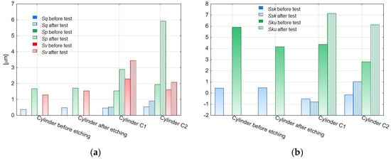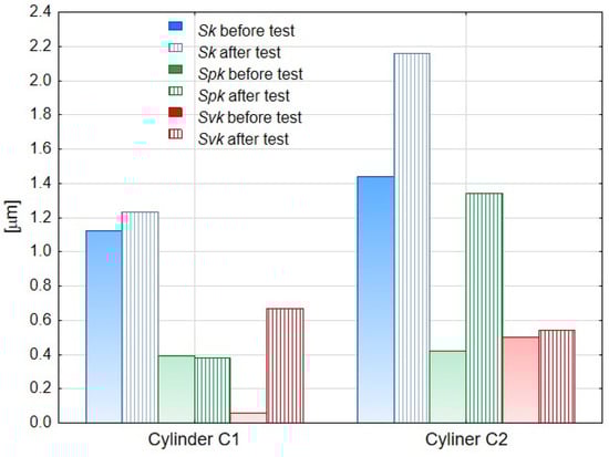 Parameters of the Abbott–Firestone curve before and after tribological test for the analyzed cylinders Sk (core roughness depth), Spk (reduced peak height), and Svk (reduced valley depth).