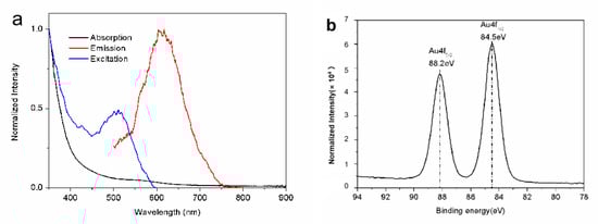 X-ray photoelectron spectroscopy (XPS) measurements were carried out to analyze the valence states of gold in DHLA-AuNCs; the XPS spectrum (Figure 1b) shows the binding energy (BE) of Au 4f5/2 and Au4f7/2 at 88.2 and 84.5 eV, respectively. The BE of Au4f7/2 fell between that of the Au(0) BE (83.8 eV) of a metallic gold film and the Au(Ⅰ) BE (86 eV) of gold thiolate, suggesting the coexistence of Au(0) and Au(Ⅰ) in the DHLA-AuNCs [27].