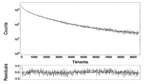 The fluorescence of the DHLA-AuNCs exhibited a double-exponential decay in H2O (321.24 ns (16.27%), 1808.17 ns (83.73%)) (Figure 2). The microsecond emission was deemed to be derived from S–Au hybrid states [36].