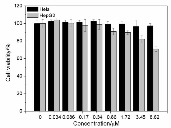 The DHLA-AuNCs were of low cellular toxicity; after being incubated with DHLA-AuNCs for 24 h, the viability of Hela cells remained above 90% at the concentration of 8.62 μM; for HepG2 cells, the viability was also around 80% at the concentration of 3.45 μM (Figure 4).
