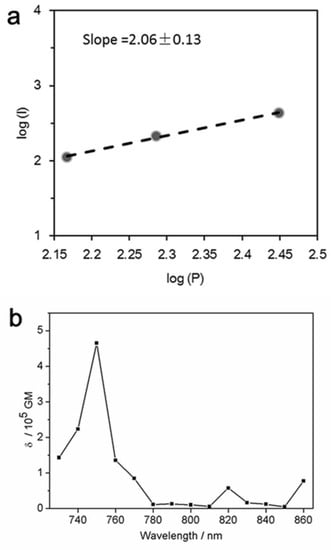 The quadratic dependence of the two-photon emission intensity on the excitation power (Figure 5a) confirmed the occurrence of two-photon excitation.