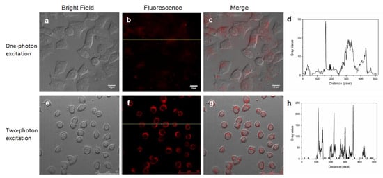 Figure 6d shows the signal profile along the line in Figure 6b, while the signal profile along the line in Figure 6f is shown in Figure 6h. This comparison exhibits the contrast between the signal and background in both imaging patterns, showing the better discrimination of the signal from the background in two-photon fluorescence imaging.