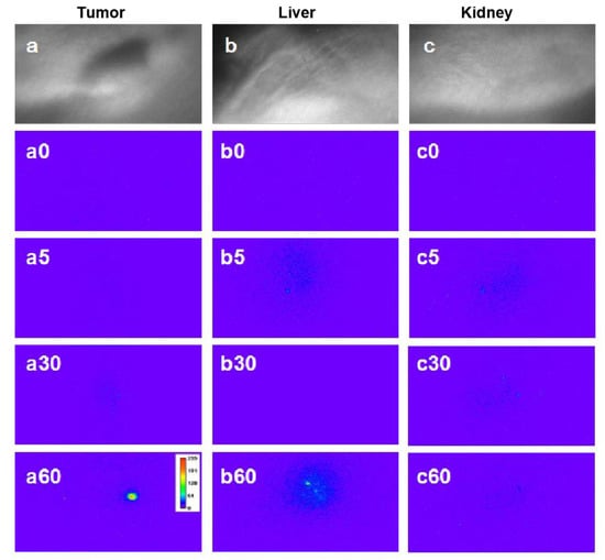 In order to implement the in vivo two-photon time-gated imaging, the tumor-bearing nude mice were anesthetized; regional bright-field images of the tumors, liver, and kidneys are shown in Figure 7a–c, respectively. The mean power of laser excitation at 800 nm was 500 mW, and the beam was 12 mm in diameter, with a Gaussian distribution of the energy density. Then, the two-photon time-gated images of these tissues were scanned before the intravenous administration of Gal-DHLA-AuNCs (Figure 7a0–c0), which substantially proved the “background-free” detection of signals in this “two-photon” and “time-gated” combined method of imaging. For in vivo imaging, the Gal-DHLA-AuNCs were intravenously administered to the tumor-bearing nude mice, and the regional two-photon and time-gated images of the tumors, liver, and kidneys were scanned at different time points (5, 30, and 60 min) as the mice were anesthetized, as shown in Figure 7 (the numbers after the letters represent the time points). Afterward, the mice were sacrificed, and the tissues were collected, and the two-photon time-gated images of the tissues were scanned (Figure 8d–f), thus certifying the live imaging.