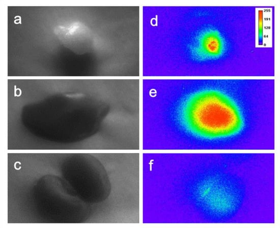 The bright-field images of the collected tissues: (a) tumor, (b) liver, and (c) kidney; (d–f): the sequential two-photon time-gated images of the tissues, the images were taken 75 min after injection.