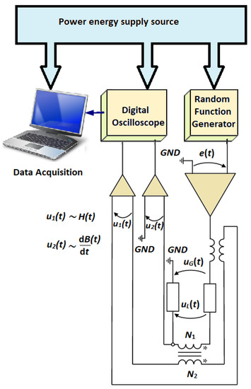 The experiment set-up presented in Figure 2 was developed at the INRIM Laboratories in Torino, Italy. Two voltage signals u1(t) and u2(t) are acquired from the magnetic core. The first one is proportional with the magnetic field strength H, while the second one is with the magnetic flux density B [24]. N1 and N2 represent the number of turns of the two windings that build the transformer having as core the FINEMET band.