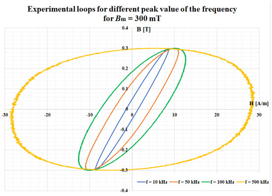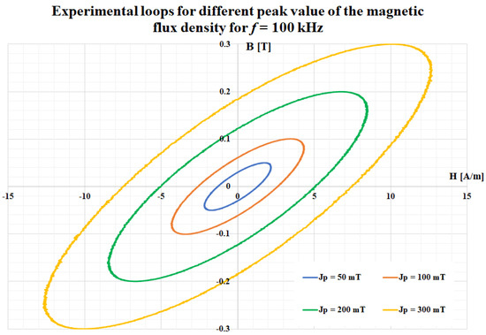 With respect to the frequency of the signal, and thus the effective value of the supply voltage, it was necessary to make an adjustment, i.e., to determine the number of coil turns. The experimental set-up has a technical limitation, and one can manage to obtain the hysteresis loops at frequency up to 200 kHz only and for low magnetic flux densities (lower than 300 mT). However, at lower frequencies (i.e., up to 50 kHz), the saturation value of the magnetic flux density can be obtained.