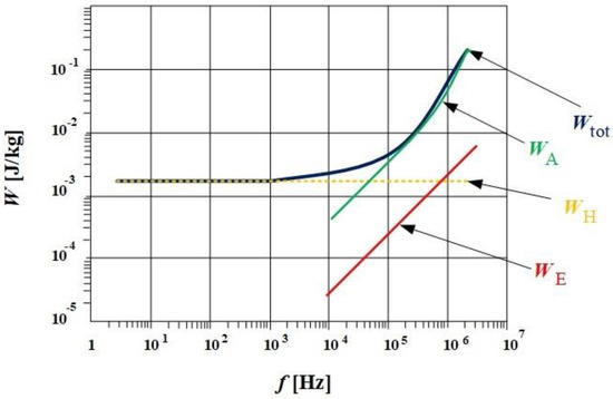 In conclusion, in the final form, in order to estimate the total energy losses, it is necessary to determine three coefficients (kh, ke, ka). The separation of losses presented above is also supported by Bertotti’s theory [36]. Here, too, measuring the area of the hysteresis loop at the lowest possible frequency (close to DC) will provide one with the hysteresis losses, WH. Then, by knowing some data about the sample (i.e., the thickness, d; the electrical conductivity, σ; and the mass density, δ) one can determine the losses due to the eddy currents, WE. Experimentally, it was found that the sum of these two terms do not represent the total energy losses. For this reason, abnormal and/or excess losses are introduced, WA. Considering these aspects, the total magnetic energy losses can be calculated as the following equation: