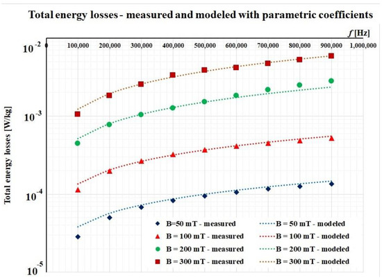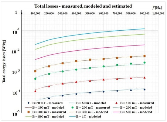 By using such linear approximations, we were able to perform an estimation of the total magnetic losses that occur at higher values of the magnetic flux densities. Figure 9 represents the first four curves (measured and modelled) and a family of three other curves for 500 mT, 800 mT, and 1 T, respectively.