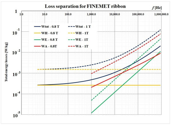 Using Equation (4), we performed a losses separation procedure for 800 mT and 1 T, respectively. The following data for the investigated nanocrystalline ribbon were considered: mass density δ = 7730 kg/m3, electrical conductivity σ = 141 µΩcm, and the ribbon thickness d = 18 µm. The results are presented in Figure 10.