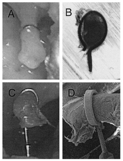 Morphological evaluation of the prosthesis loop. (A) Endoscopic and (B) micro grinding photography of tight crimping of fixing loop of prosthesis, (C) endoscopic and (D) scanning electron microscopy of tight crimping of fixing loop of prosthesis. Source: adapted from Huber et al. [12].