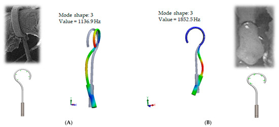 Consequently, other results of the numerical analysis, according to the fixation of the loop, are presented in Figure 5. As it can be seen, the third mode of the standard prosthesis constraining with target crimping is 1.14 kHz (Figure 5A), whereas the third mode of the over-constrained loop of the standard stapes prosthesis is 1.9 kHz (Figure 5B). Moreover, it has been found that this third mode exhibits the bending of the thick part of the piston, due to which the prosthesis tends to bend and contact boundary surfaces in the cochleostomy.