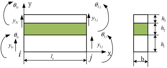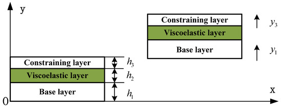 - Considering the compression deformation of the viscoelastic layer perpendicular to the neutral plane of the beam, it is considered that the base beam layer, the damping layer, and the constraint layer have different deflection functions, and the transverse displacement of the viscoelastic layer is the linear interpolation of the two surface layers;