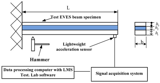 The experiment is designed to test the response of an EVES beam. Figure 4 shows the experimental setup. In the experiment, use a self-made lightweight, soft hammer with a rubber head to lightly hit the end of the EVES beam to excite vibration. A lightweight acceleration sensor is pasted at the free end to measure the vibration signal, which is collected and adjusted by the LMS SCADAS III 316 data acquisition system, and then analyzed by the LMS test. Lab vibration and noise test analysis system to obtain the natural frequencies and damping ratios.