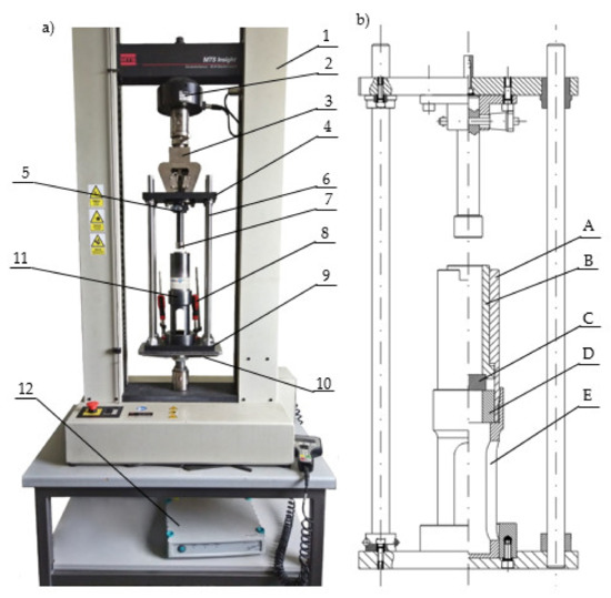 Testing station for the examination of the elastic modulus of dry ice as a function of the density. (a) 1: MTS durometer; 2: machine sensor; 3: machine grip; 4: upper plate; 5: Kipp locking pin; 6: guide assembly; 7: piston; 8: clamps; 9: lower plate; 10: machine base; 11: compacting sleeve assembly; 12: Spider 8 instrumentation amplifier. (b) Compacting sleeve assembly, cross-section view. A: upper sleeve; B: compacting chamber; C: compacting chamber bottom; D: spacer sleeve; E: lower sleeve.