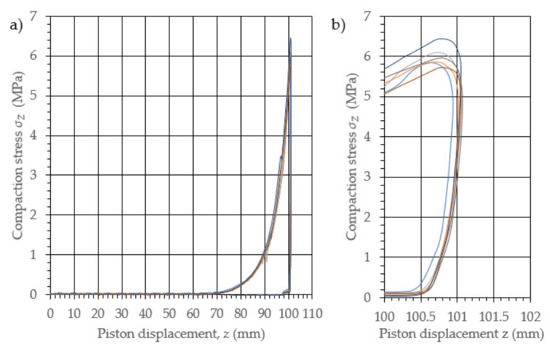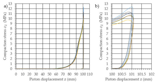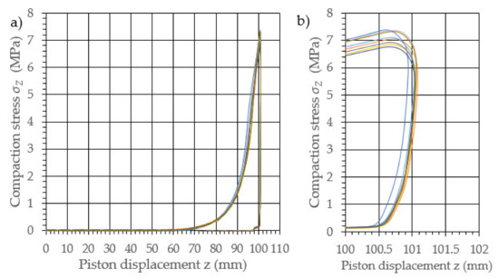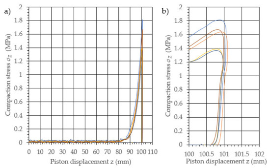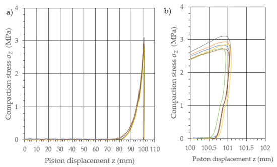 The testing station was first placed on the durometer to perform the initial setup to ensure the concentric arrangement of its components. This process entailed arranging the assembled testing station so that the piston (7, Figure 2a) was installed on the upper plate (4, Figure 2a) with the locking pin (5, Figure 2a) placed inside the compacting chamber (B, Figure 2b) during the installation of the main plate (4, Figure 2a) in the durometer grip (3, Figure 2a). The clamps (8, Figure 2a) were used in a sequence to attach the lower plate of the testing station (9, Figure 2a) and the guide assembly (6, Figure 2a) to the plate built into the durometer (10, Figure 2a), for the purpose of immobilizing the assembly. Furthermore, it was tested to ensure no additional resistance occurred during motion. After the setup, the compacting sleeve assembly (11, Figure 2a) and the piston (7, Figure 2a) were removed from the station and placed in the dry ice container to cool down for approximately 45 min. The compacting sleeve assembly and piston were cooled down with dry ice to reduce their temperature, achieving a temperature value similar to the tested material, −65 °C. Temperature of the chamber was measured using thermocouple sensor type K. After this, the testing station was reassembled and the piston surface was placed in the reference position in relation to the compacting chamber, and the testing station was cooled down for another 5 min. The compacting sleeve assembly was then placed on the scale to measure the weight of the assembly; the determined amount of dry ice, depending on the expected test sample density after compression, was then placed inside the compacting chamber with a diameter of 29.95 mm, measured after cooling. Subsequently, the piston together with the compacting sleeve assembly were mounted in the guide assembly, fixed in the durometer grips and the measurement was initiated according to the algorithm programmed into the TestWorks 4 software that controlled the MTS machine. Simultaneously, the result acquisition was initiated with Catman Easy software. The machine performed the following programmed sequence: