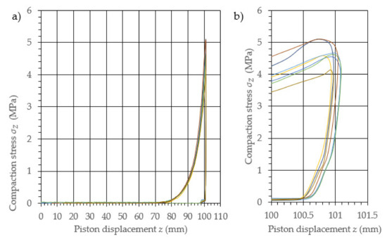 Characteristic curves for the compression and relaxation of dry ice with a final density of 1574.5 kg/m3. (a): The overall course of the characteristics; (b): an enlarged relaxation section of the compacted material.