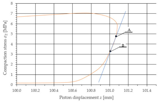 For the purpose of determining the value of Young’s modulus, a function describing the change in the compacting stress value between points A and B was established, by means of REGLINP software for linear regression using the least squares method, available in Microsoft Excel. For the determined function, the directional parameter value was equal to the value of Young’s modulus. The calculations provided herein were performed for each of the determined characteristics, and the average values of each of the examined sample densities are provided in Table 2.