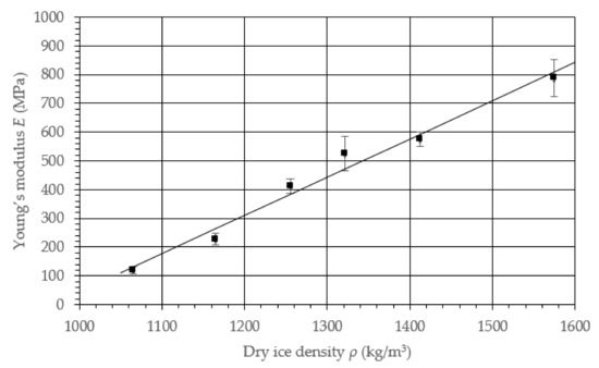 On the basis of the determined equation, it is possible to determine the value of Young’s modulus at each stage of the dry ice compaction process. This equation can be used in numerical studies concerning the description of the processes of compaction (using, for example, DPC, CC and MC models [25,26,28,31,32]), and extrusion (with the use of the elastic-plastic model [33]) of dry ice.