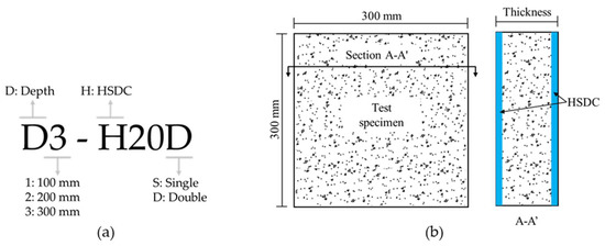 To evaluate the EMI SE and impact resistance of the reinforced concrete, twelve specimens were prepared, as detailed in Table 5. Typical square specimens, with a side length of 300 mm and thickness of 100, 200, and 300 mm, were fabricated. The naming of experimental variables is depicted in Figure 2a. The total thickness of specimens was fixed regardless of HSDC strengthening. After demolding, side surfaces of the NC specimen were given high roughness to increase the bond strength with HSDC, using metallic chiseling, then HSDC was cast onto that surface [15]. The details of strengthening with a single and double layer of HSDC are shown in Figure 2b. All test specimens were cured at a steady temperature (20 ± 1 ℃) and humidity (60 ± 5%) until the designated test day.