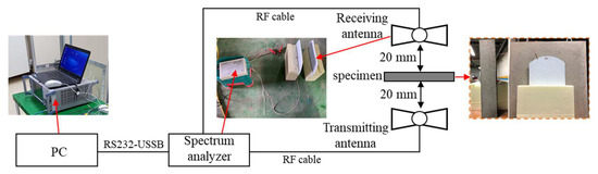 The near-field condition method was used for the EMI SE test of concrete specimens, in which customized EMI instrumentation (Jinju, Republic of Korea) utilizes a frequency range of 400–1400 MHz based on the transmitting and receiving facility. This method was demonstrated to show similar results to the far-field condition results, based on MIL-STD-285 [16]. The details of the test setup are shown in Figure 3. The wide-band log-spiral antennas were used as transmitting and receiving antennas, connected with coaxial cables (RFOA1, RS-232), and delivered signals to a computer without loss. With distances of 20 mm from the concrete specimen to the testing apparatus, two antennas were installed perpendicular to the center of the specimen. Before SE measurement, calibrations were carried out to ensure correct measurement from the nominal value on the receiver. Then, the test specimen was placed between two antennas, and values were measured. The EMI shielding test was repeated five to six times for each specimen, and the average values were used in this research.