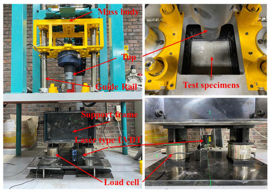 For the evaluation of impact resistance, a drop-weight impact test was conducted on all specimens under low-velocity impact loading conditions, employing a user-defined setup. The detailed setup of the drop-weight impact test is shown in Figure 4. The clear span of the test specimen was 250 mm, and all sides of the specimen were fixed to prevent rebounding upon impact. The cylinder frustum head (a diameter of 70 mm) was used as the drop-weight to prevent severe damage to the test specimen. The cylinder frustum head was dropped on the center of the test specimen, applying a weight of 100 kg from a height of 200 mm (increased at each loading step by 100 mm). Two load cells were mounted on either side of the supports to measure the reaction force. The maximum and residual deflections were measured using a laser LVDT (KL4-120NV, Tokyo, Japan), which was placed at the center of the bottom side of the test specimen. All instruments were connected to a dynamic data logger (DEWE-43V, Trbovlje, Slovenia), which measured 200,000 data counts per second.