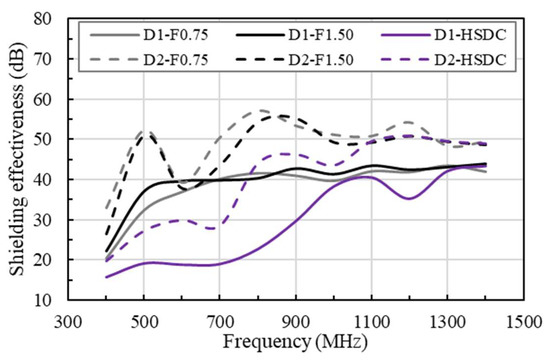 The results of the EMI SE test for HDSC of differing thicknesses are shown in Figure 5, comparing it with concrete reinforced with two different volumes of steel fiber (test results from Yuan et al., 2021) [5,6]. Briefly, 0.75 and 1.50 vol.% of steel fiber contents in reinforced concrete specimens show similar EMI SE behavior. Specimens reinforced by 0.75 vol.% of steel fibers were effective in surpassing the percolation threshold. According to previous research [2,5,6], when steel fibers are randomly dispersed through concrete, a matrix is formed that produces a conductive grid through an effective and continuous electrical pathway, thus increasing the EMI SE of the specimen. Therefore, the concrete specimens that were reinforced with steel fibers showed an SE of 40 dB to 50 dB, in a range of 500–1400 MHz, respectively, without resonance. Thicknesses of 100 and 200 mm in HDSC reinforcement demonstrate a continuation in this SE growth, between the ranges of 400 and 1000 MHz. Additionally, the SE of the specimen was 40 dB to 50 dB when between 1000 and 1400 MHz. It can be surmised that the SE performance of fiber-reinforced concretes (F0.75-N and F1.50-N) were higher than that of HSDC, even though HSDC presented greater fiber contents (than that of F0.75-N specimens), comparatively speaking. This performance is influenced by the fiber lengths used, with HSDC presenting a length of lf = 19.5 mm, and reinforced concrete showing a length of lf = 35 mm, thus leading to the conclusion that the fibers are significantly shorter in HSDC. Fiber length, size, shape, and aspect ratio all played an important role in the SE of the concrete when reinforced with fibers [17].