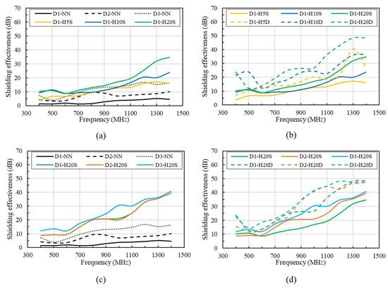 The results for the EMI SE tests of concrete specimens with varying thicknesses of HSDC are shown in Figure 6. As a result of increasing HSDC thickness, SE displayed an increase at the same test frequencies, additionally seeing an improved result in increasing frequencies; this relationship is observed in Figure 6a. One-layer 5 mm-thick HSDC concrete strengthening saw a greater SE response than that of 200 mm-thick standard non-strengthened concrete, and like that of 300 mm-thick concrete. SE was noticeably seen to increase when double-layer HSDC strengthening was introduced, as shown in Figure 6b. Although the double-layer reinforcement improves shielding effectiveness over single-layer reinforcement, the shielding effectiveness is increased at a certain frequency owing to the resonance phenomenon in the double-layer reinforcement. An increasing HSDC thickness also leads to the presence of resonance peaks that shift toward lower test frequencies. The cancellation of reflected waves in the first and second HSDC layers explains this occurrence. In the scenario where the matrix and absorber materials experienced interference resulting from the reflected waves, the distance of strengthened layers was approximately one-quarter of the propagating wavelength, multiplied by an odd number (thickness (w) = (odd number * propagating wavelength of selected materials)/4) [2,18]. Furthermore, specimens strengthened with the same HSDC parameters but altering the initial conditions showed similar SE results; this occurred over the entire frequency range (see Figure 6c,d).