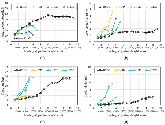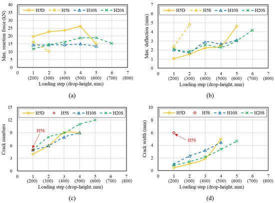 Impact test results of single-layer HSDC-strengthened specimens: (a) maximum reaction force at each load; (b) maximum deflection at each load; (c) number of cracks at each load; (d) maximum crack width at each load.